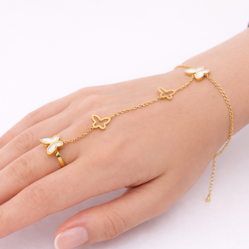 Elevate your style with this elegant butterfly hand harness bracelet, crafted in anti-tarnish stainless steel for lasting shine and durability. Designed with delicate butterfly motifs connected by a fine chain, this statement piece links a bracelet to a matching finger ring, creating a graceful and modern silhouette.