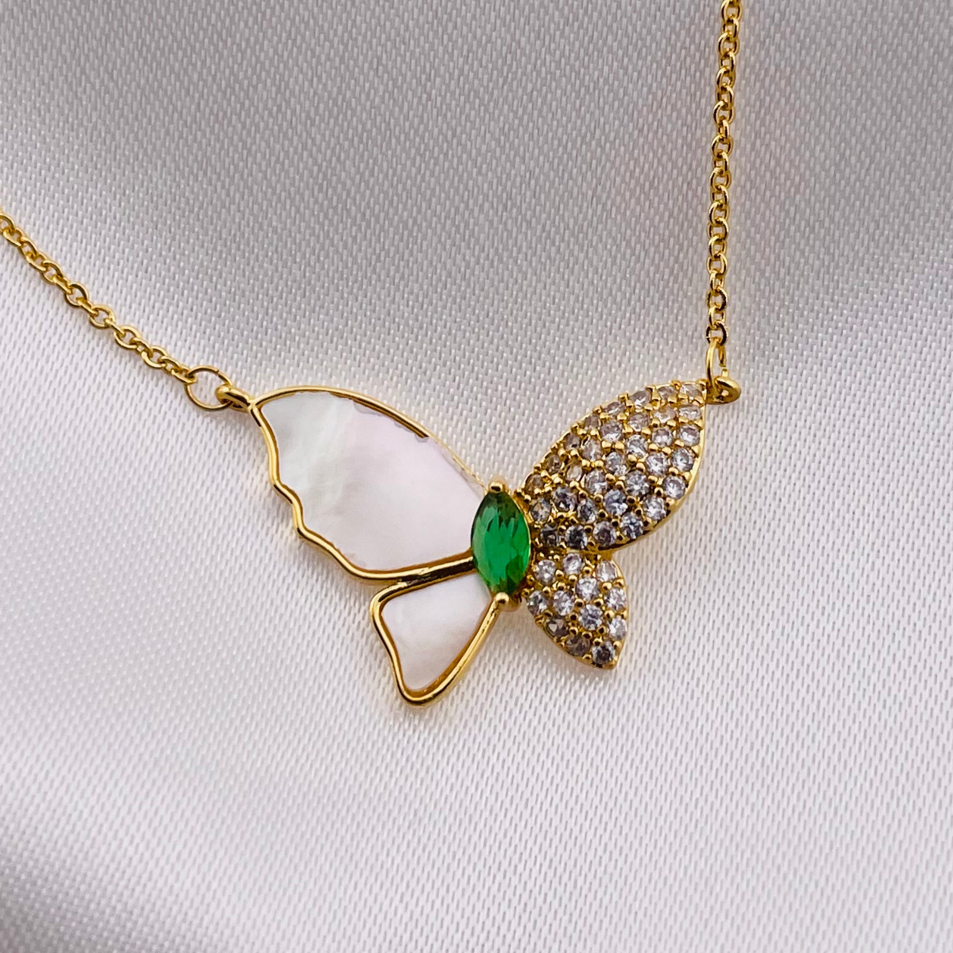 BUTTERFLY NECKLACE PEARL PENDANT WITH -GREEN STONE, ADJUSTABLE CHAIN, FASHION JEWELRY IMITATION GOLD