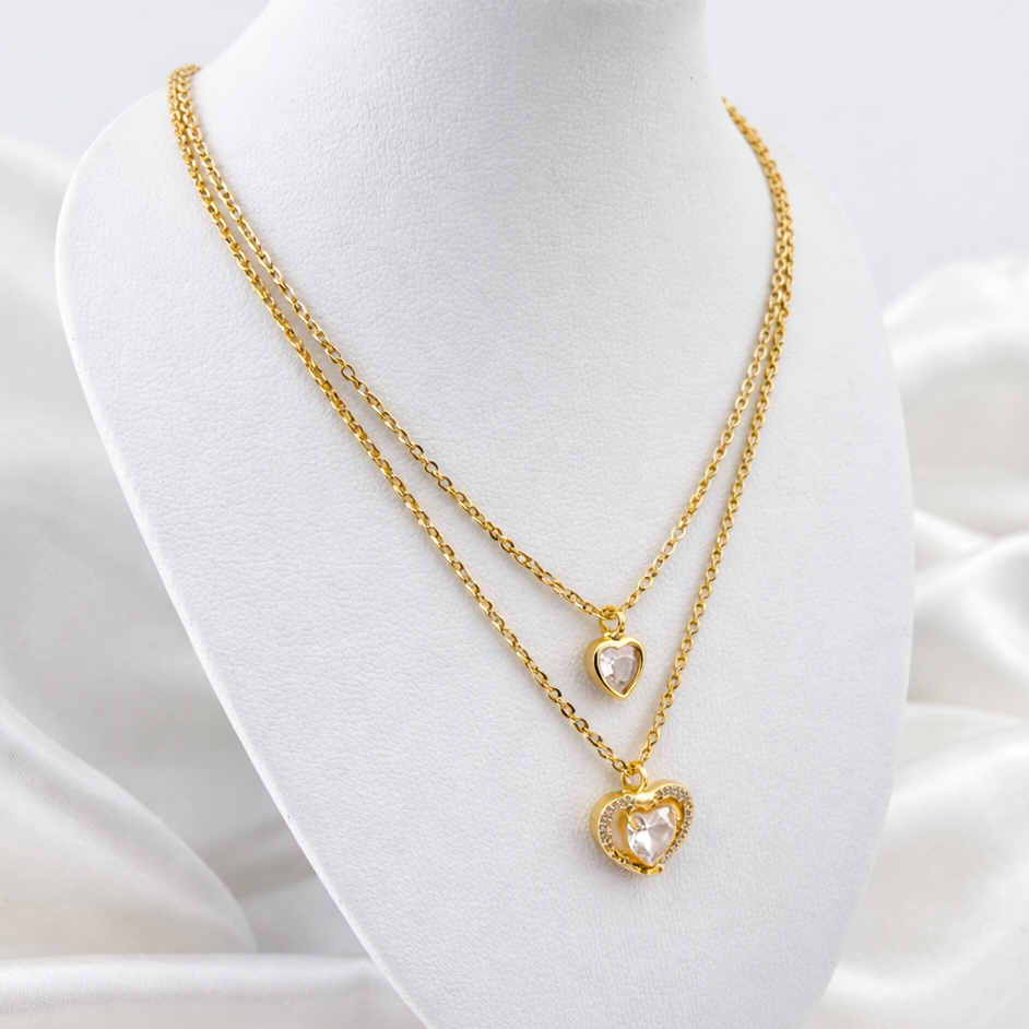 DUAL LAYERED NECKLACE DOUBLE HEART STONE PENDANTS, ADJUSTABLE CHAIN, FASHION JEWELRY IMITATION GOLD