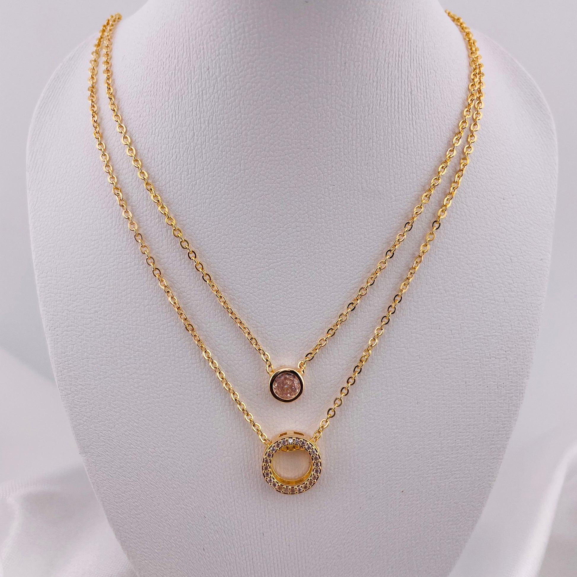 DUAL LAYERED NECKLACE DOUBLE RING PENDANT-STONE, ADJUSTABLE CHAIN, FASHION JEWELRY IMITATION GOLD