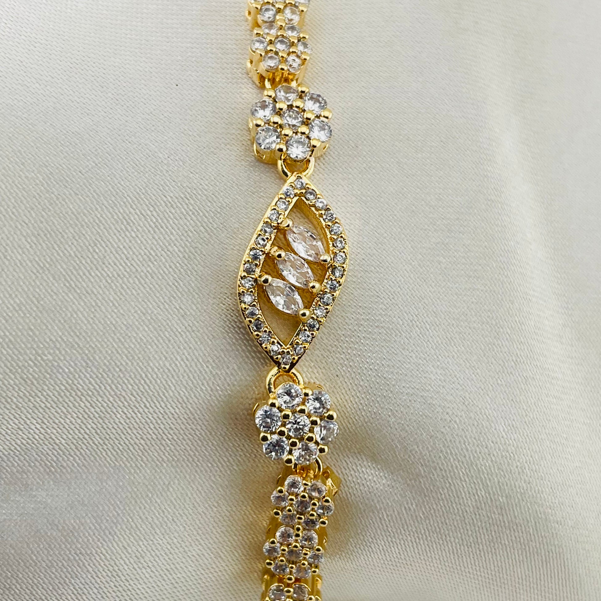 Crafted with an adjustable box chain, it offers a comfortable and secure fit for any wrist size. Finished in a rich imitation gold tone, this bracelet delivers a premium look while remaining lightweight and easy to wear—perfect for enhancing your special occasion outfits.
