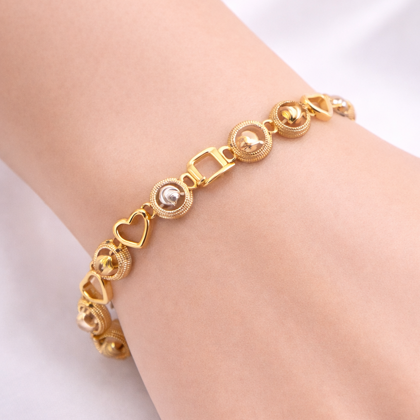 Heart Link Bracelet – Textured Round Motifs with Dual-Tone Accents | Imitation Gold Fashion Jewelry