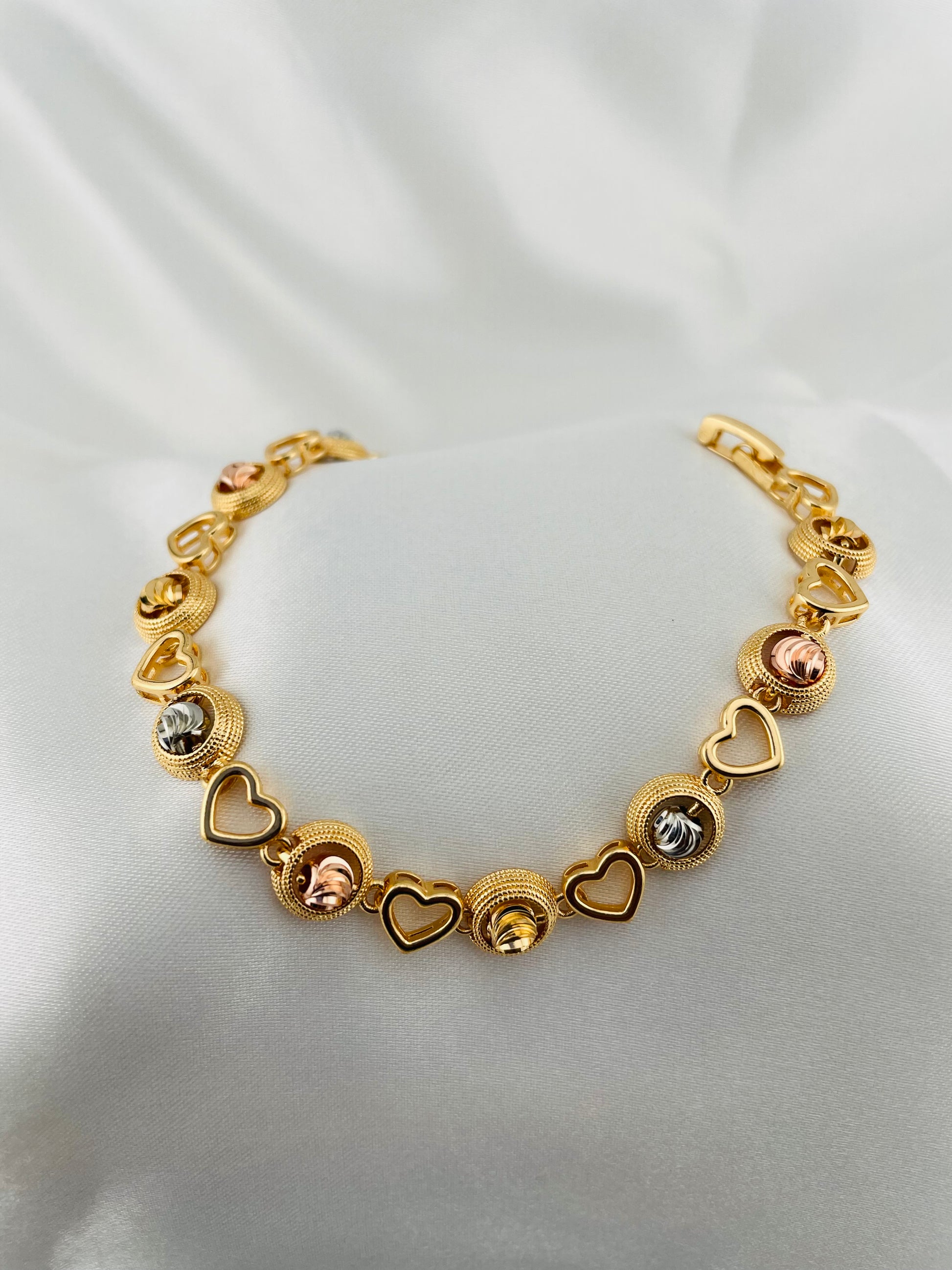 Add a touch of elegance and charm to your jewelry collection with this beautifully crafted heart link bracelet. Designed with alternating heart-shaped links and textured round motifs, this bracelet showcases a refined blend of gold, silver-tone, and rose-gold accents for a rich, premium look.