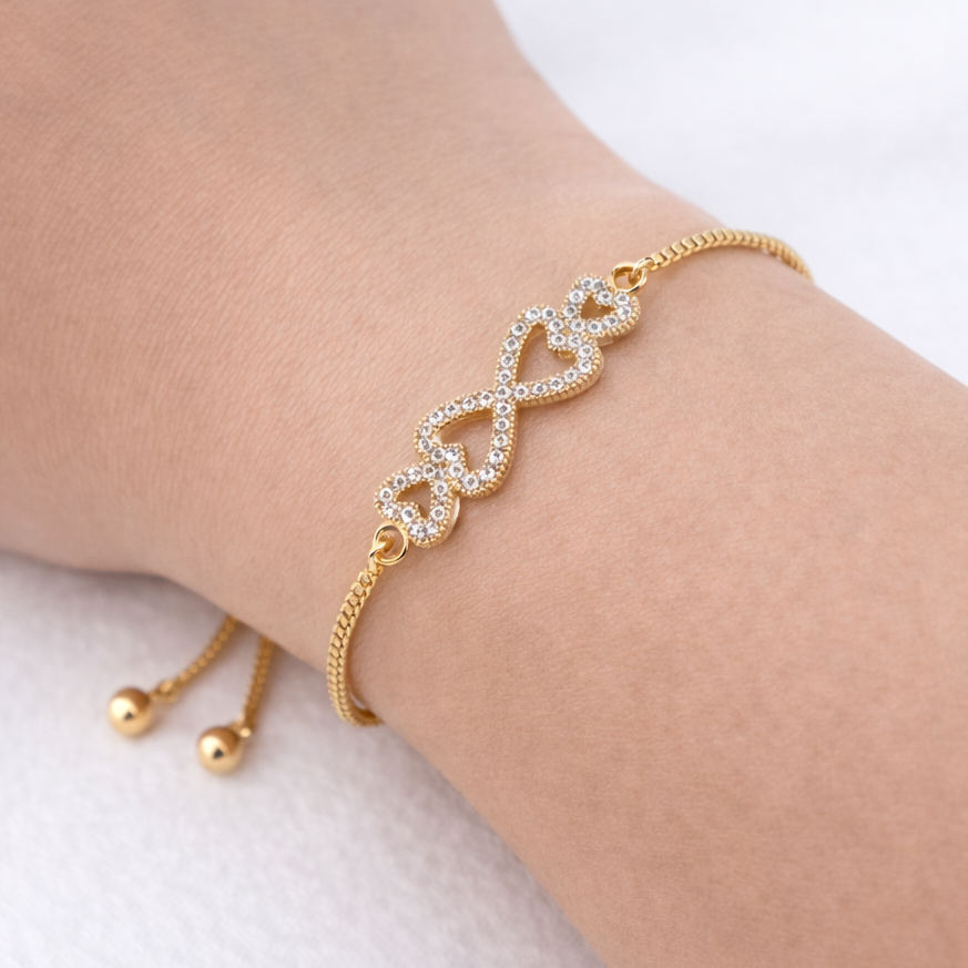 Infinity Heart Bracelet – Stone-Outlined Hearts | Adjustable Imitation Gold Bracelet