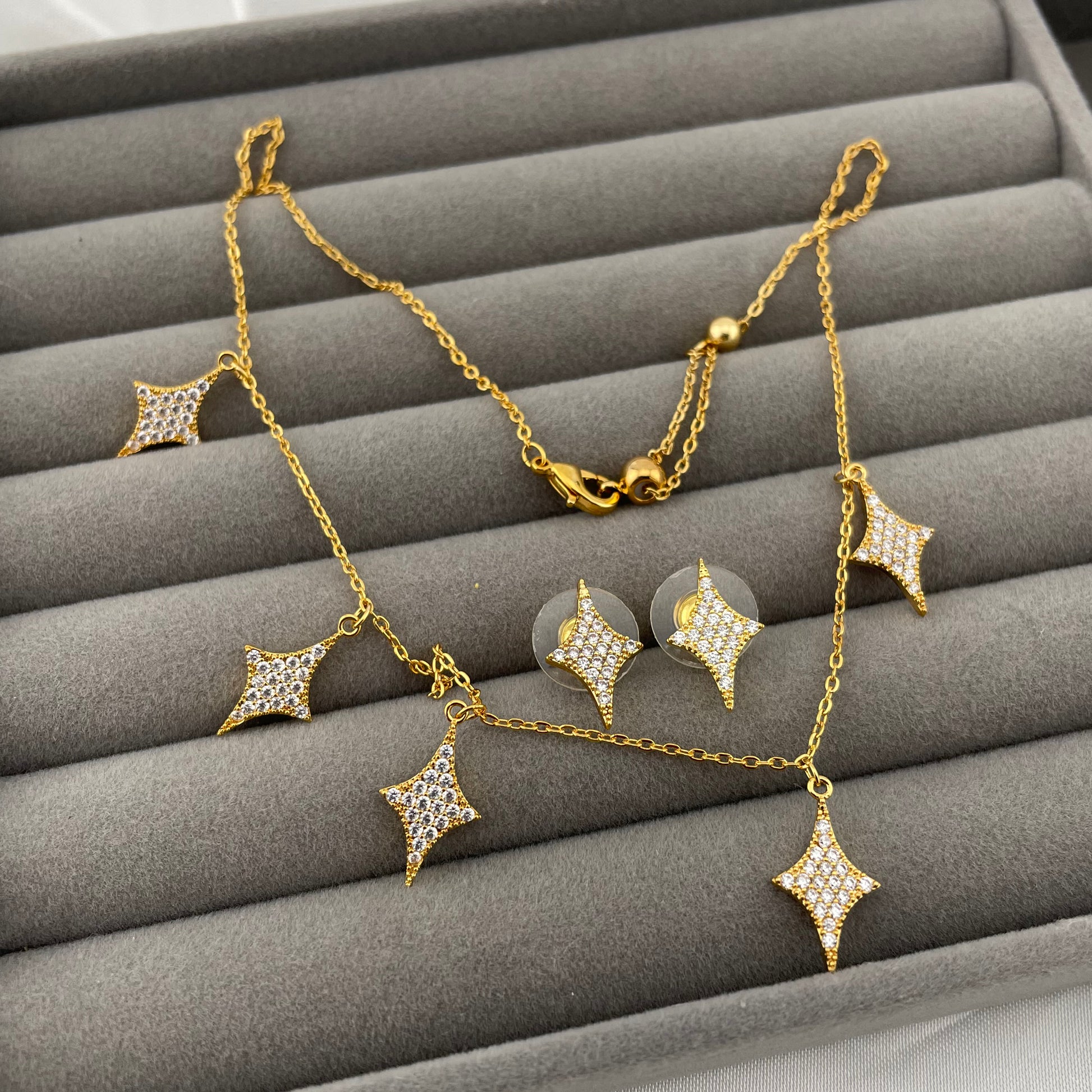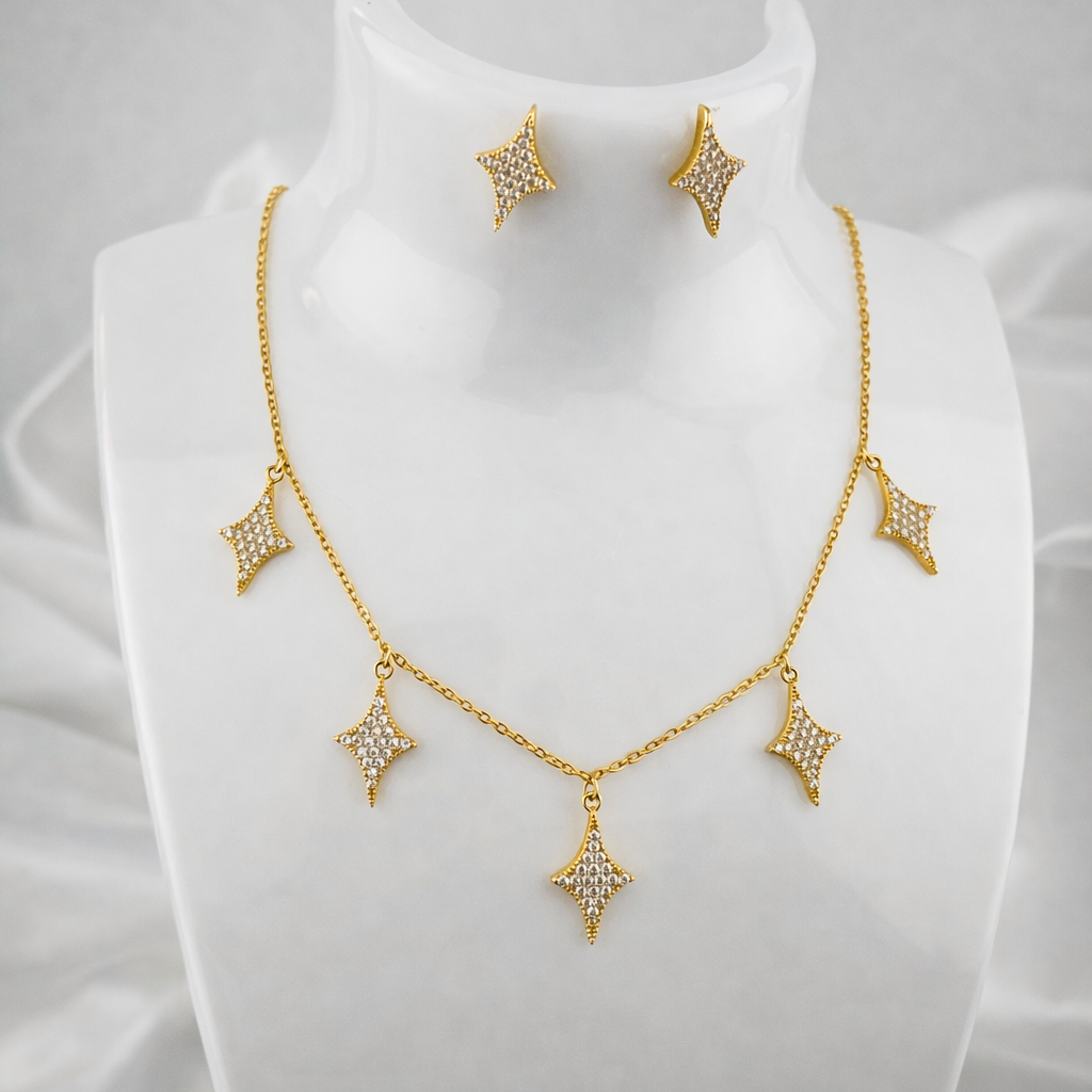 NECKLACE AND EARING SET, DANGLING STARS PENDANTS, ADJUSTABLE CHAIN, FASHION JEWELRY IMITATION GOLD